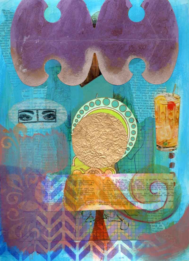 This is a digital print of a mixed media collage painting that combines images from vintage magazines with layered stencil work and bold, majestic shapes. A glass of iced tea from an old magazine adds a whimsical touch to the composition, blending nostalgia with a sense of regal, playful elegance. Each element is carefully arranged to create a unique, textured piece that balances color, form, and vintage charm.