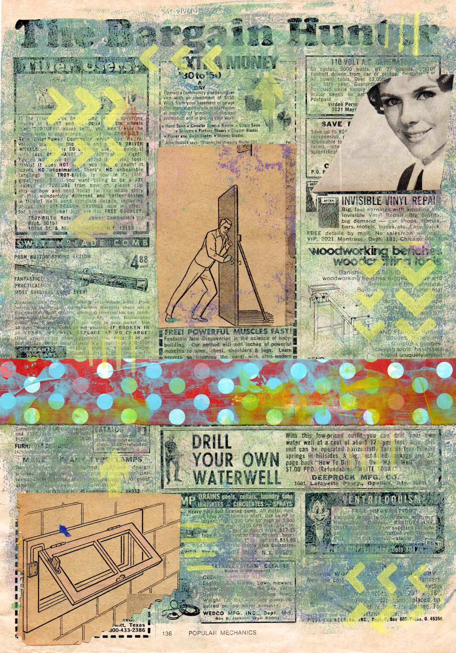 The Bargain Hunter is a one-of-a-kind mixed media piece on a vintage magazine page. I layered painting, collage, and stencil work to transform the original imagery into a bold, textured composition. Vintage ephemera meets contemporary artistic expression in this playful, layered work.